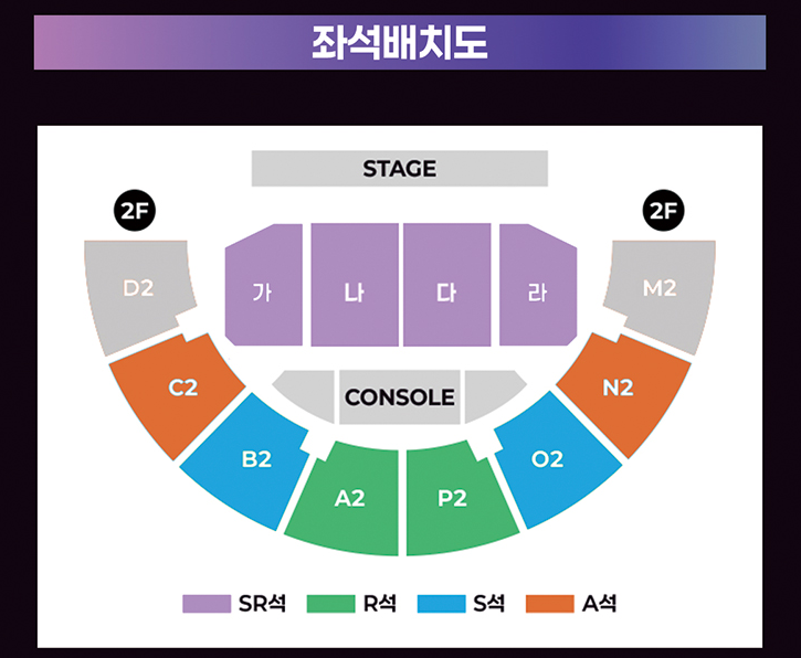 - 무대 정면: C, D, E, F 구역이 가장 무난하며 무대를 정면으로 볼 수 있습니다